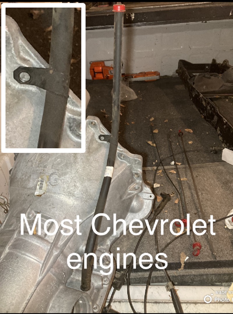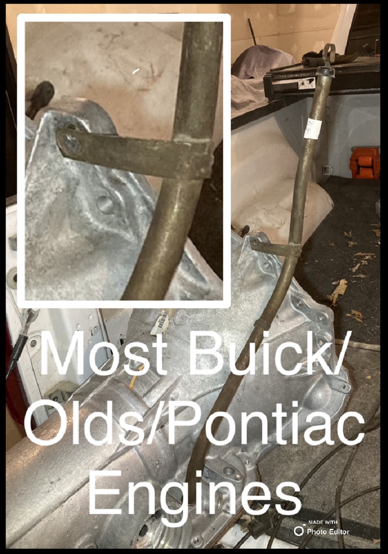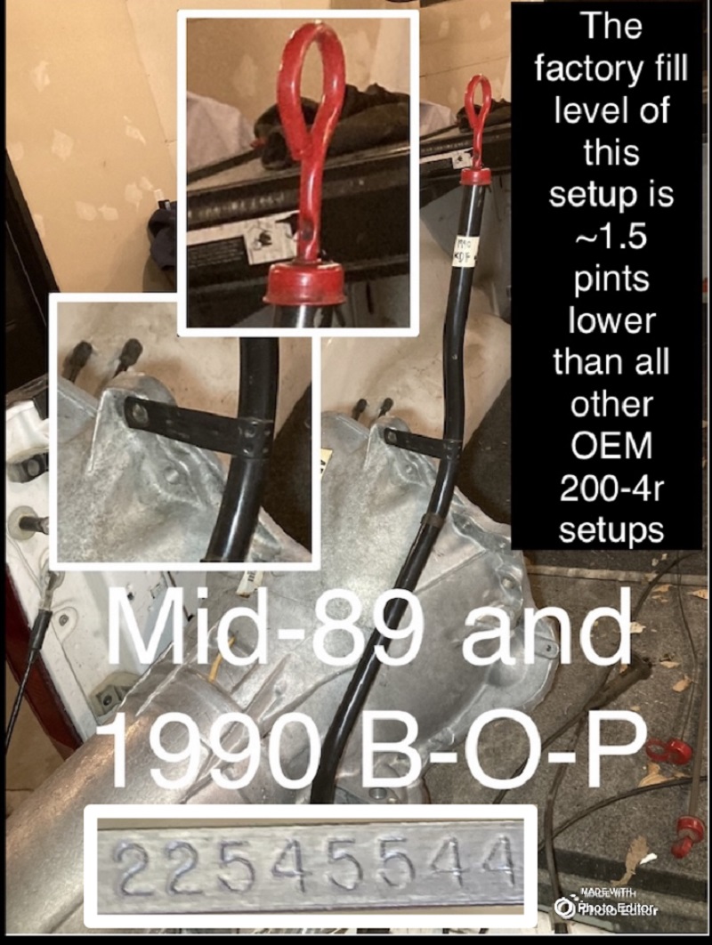 Only real thing to note is that the factory seems to have altered the full level mid year 1989 and started under filling the units by about 1.5 pints. I assume (but don’t know) that the bean counters realized that by 89 these things were only being installed in land barges that can’t launch fast and have no risk of fluid slosh causing cavitation. I do not have a pic of the mid-89 and 90 reduced level Chevy stick and tube but I’m sure you can figure it out from the pics. Should have the same dipstick handle and part number as the BOP one pictured.