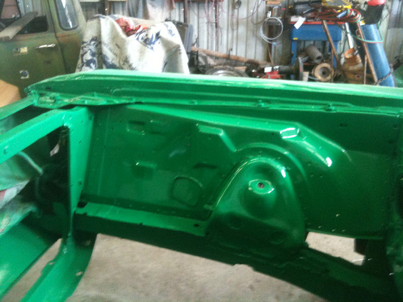 above shows the inner fender and frame rail repair after painting. We intend to paint the car the color of Bobby Labonte's old #18 Nascar car. Interstate Green. Sean gave me the paint codes, but, no one around here carries the brands of paints he found so I guessed. First guess was too yellow so I picked one about five shades greener...went too far and it has too much blue in it. The picture below is the same paint but this picture came out too blue...it's probably in between the two pictures in reality. Not Interstate Green no matter how you cut it. Oh, well.