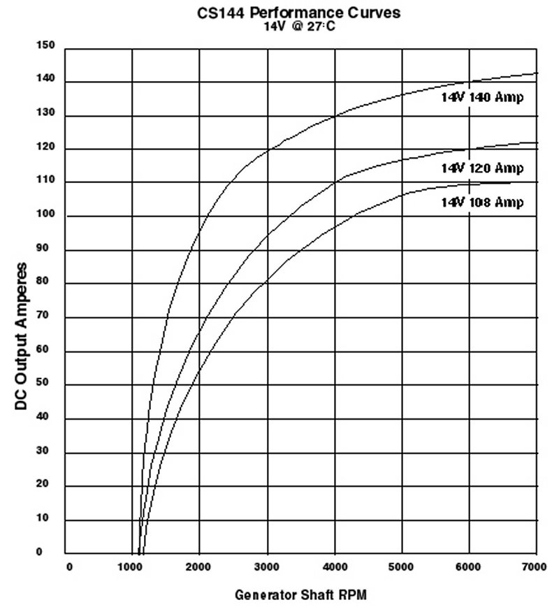 These curves show amperes vs shaft rpm at 14.0 volts. Our stock alternators are of the first generation CS144-120 amp variety. The 140 amp alternator came out in 1992 and is a revised alternator improving on some of the weaknesses in our units. This is my suggested replacement. Not because it is higher output (significantly so at idle) but, because it is just a better all around unit and is a direct replacement for ours.