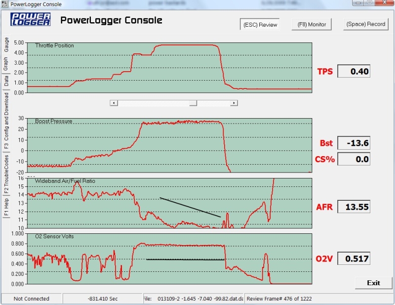 Below is a log comparing the output from a wideband O2 to the output from the factory narrow band. During the period under boost there is more than a 20% variation in actual air to fuel ratio when the factory O2 voltage is basically flat. Something to think about.