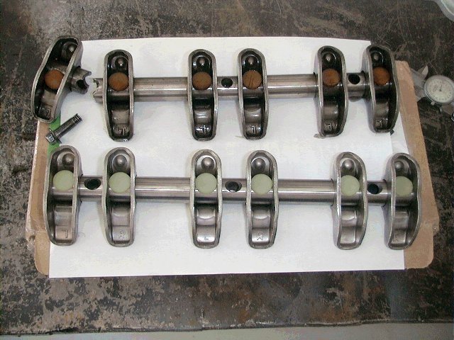 Above is the new assembly accompanied by the rocker shaft supports sold by RJC Racing and the shims I used under the shaft to correct lifter preload.