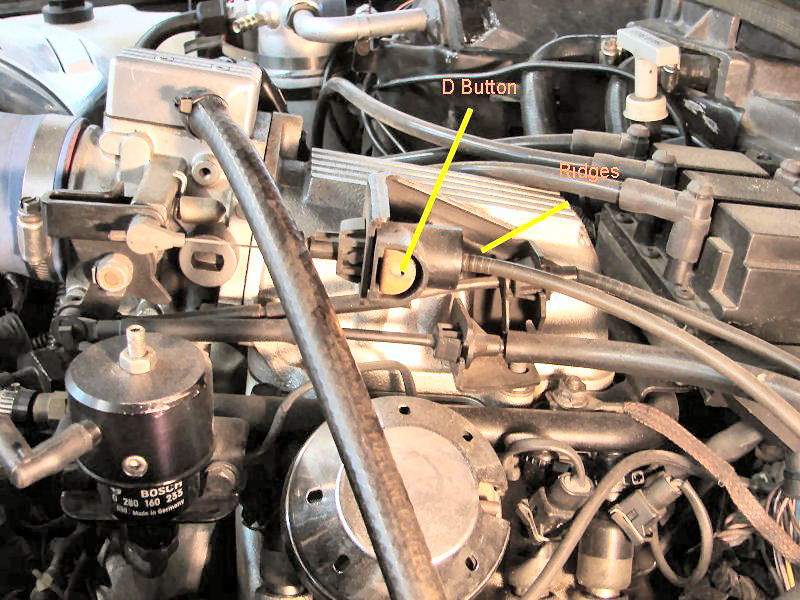 See the ridges in the picture? Counting the exposed ridges will give you a reference point as to the adjustment. With age, sometimes the cable has stretched a bit and we may find the car shifts better by depressing the D Button and pulling the the cable back a notch for better shifts. This may vary from from car to car so don't get the idea that the four ridges shown on this car is the required adjustment for your car. It should be somewhere in the ball park, however.